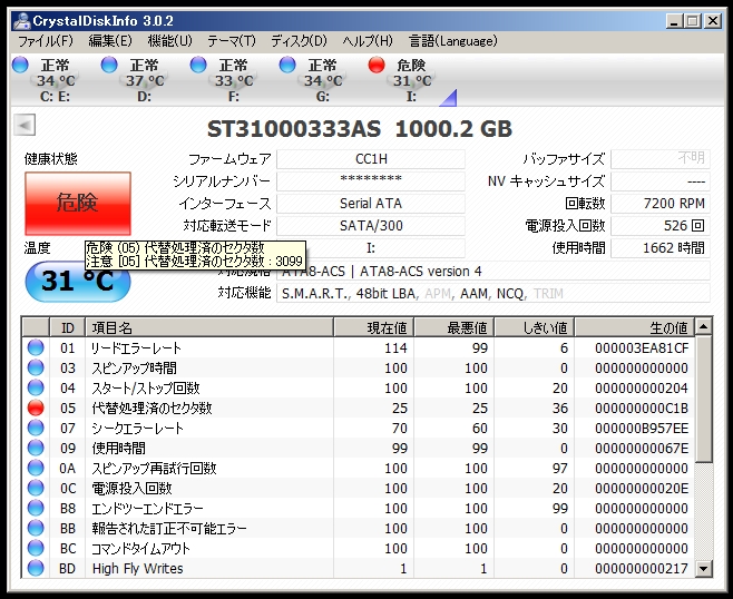 CrystalDiskInfoで代替処理済のセクタ数の項目で警告が出た。