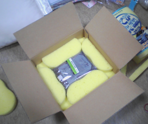 100円均一で買ってきた洗車スポンジ×3を加工して梱包。